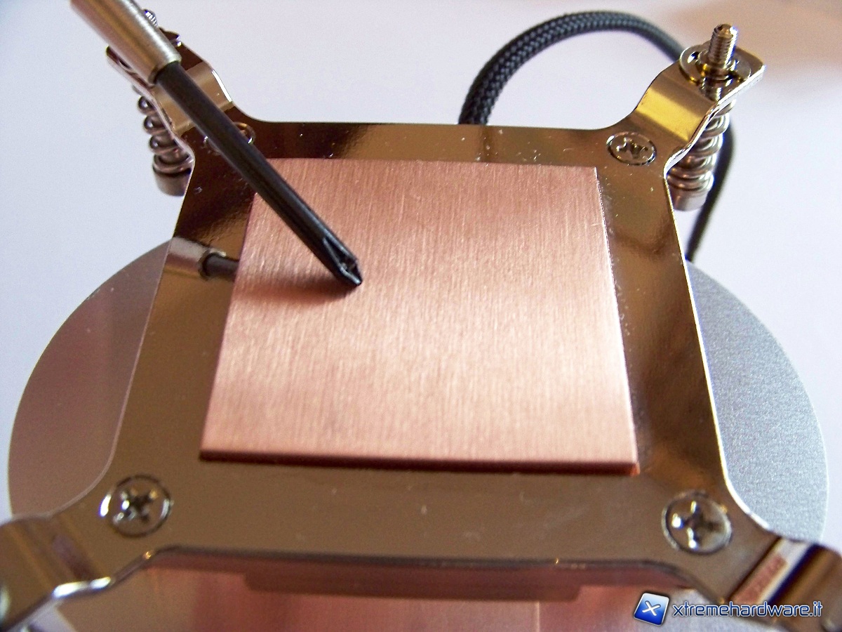 Possiamo notare come la superficie non sia lappata a specchio presentando delle righe che, intrappolando l’aria, diminuiscono la superficie di scambio termico tra dissipatore e processore. Qui gioca un ruolo fondamentale la pasta termica che provvede ad aumentare la superficie di contatto eliminando queste venature.