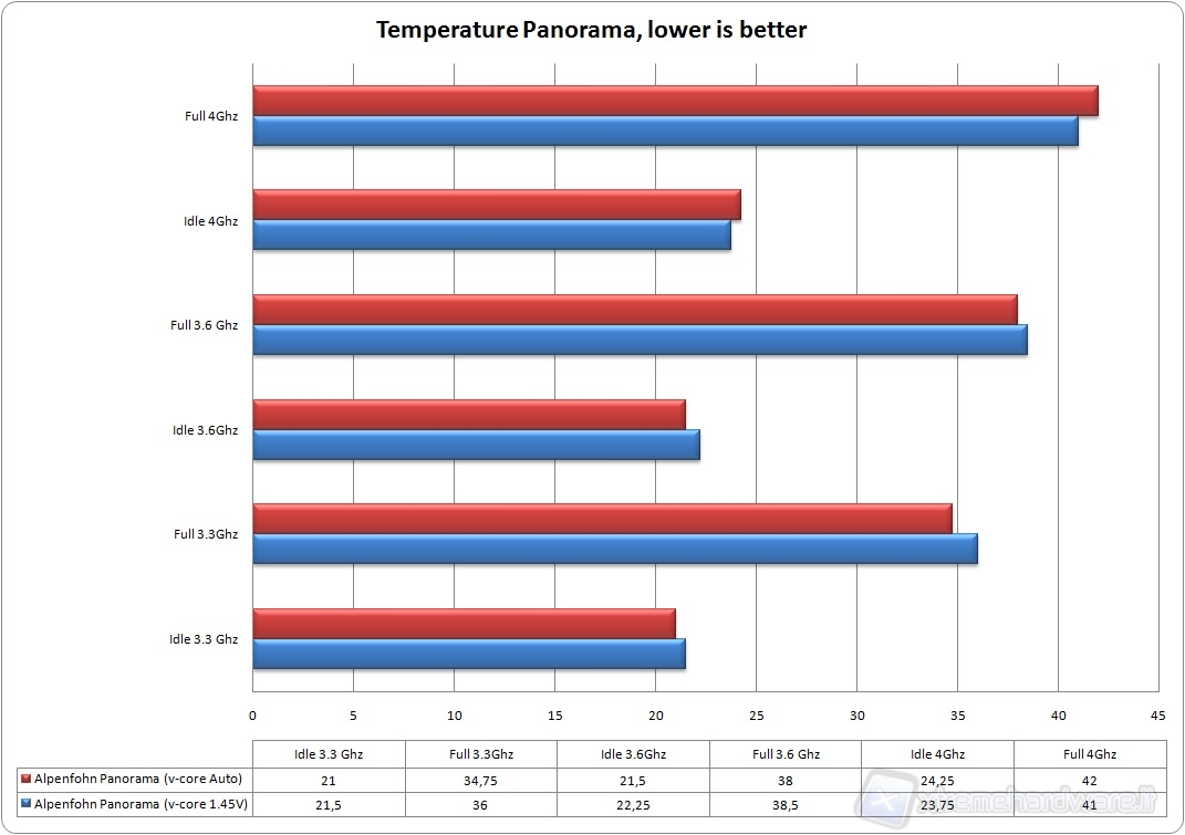 Abbiamo effettuato i test con un Phenom X2 560 e possiamo dire che in questo caso il Panorama si è comportato davvero bene con questa cpu che scalda poco, permettendoci di fare un discreto overclock arrivando a 4ghz in piena stabilità. Il dissipatore rispetto al modello reference di AMD e Intel sicuramente è in grado di darci parecchie soddisfazioni. I 41°C in full-load ovviamente sono una temperatura irrisoria in overclock, cosa impossibile da raggiungere con altri modelli di processori. Il Panorama non è nato per fare overclock, ma se si posseggono cpu che non scaldano molto anch’esso è in grado di fare la sua parte permettendoci leggeri margini di overclock.