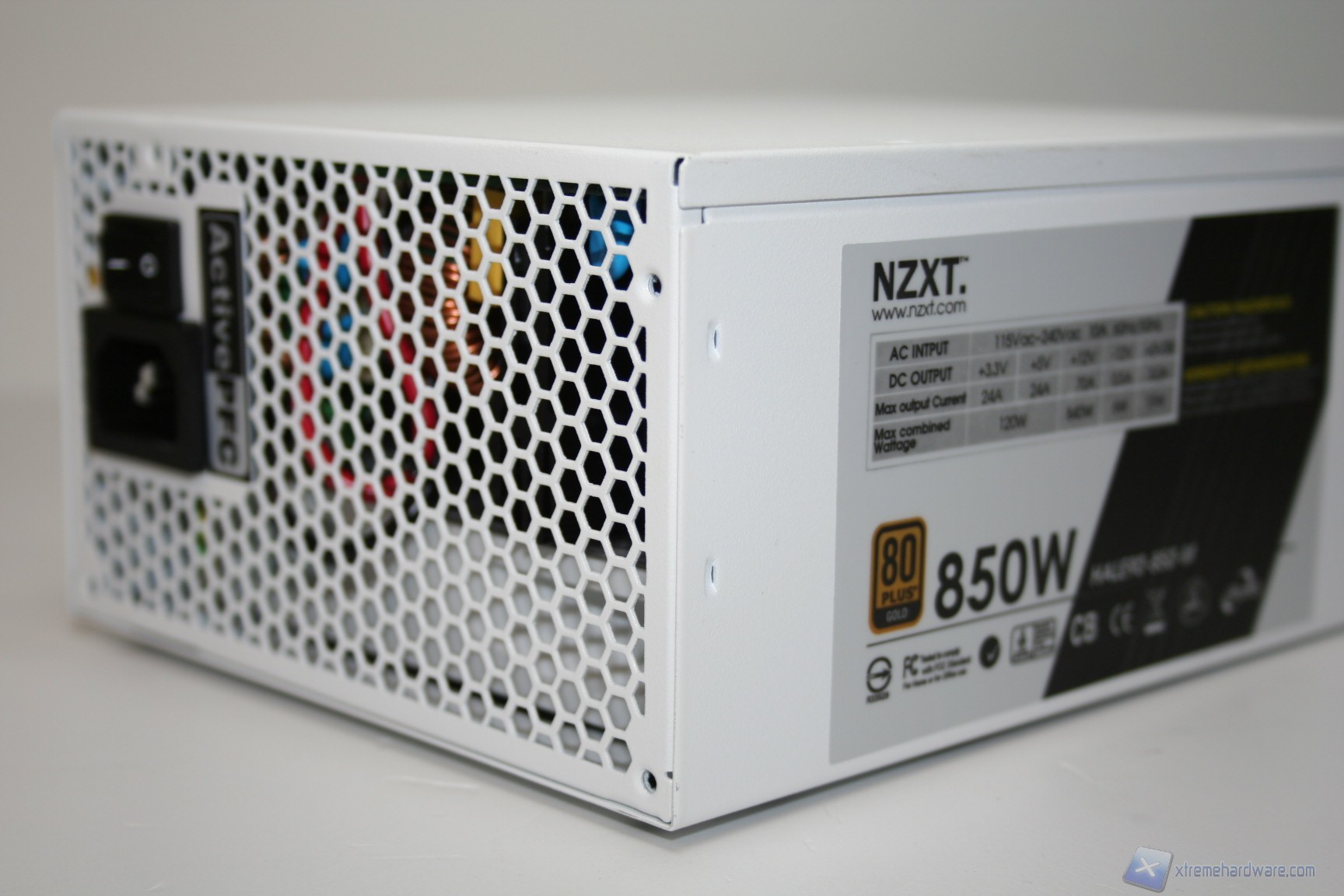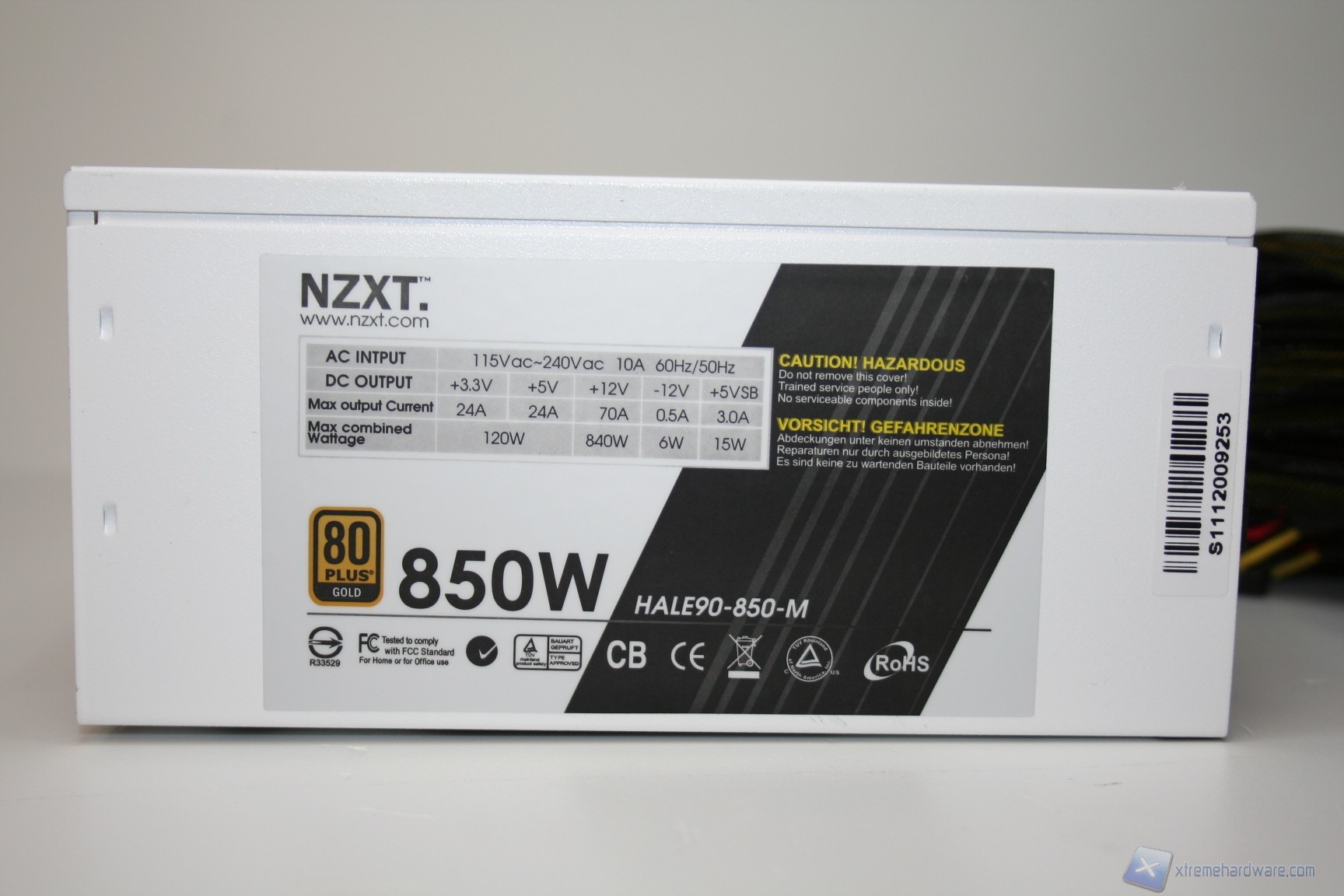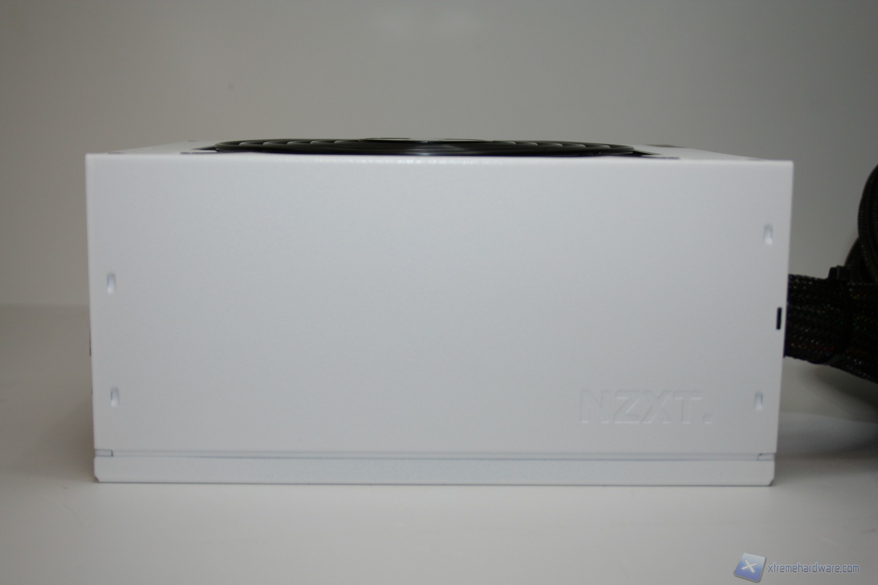 Il design esterno a prima vista sembra essere classico, ma robusto e dal layout ordinato. Il colore bianco si abbina perfettamente ai cabinet e alle ventole NZXT, che nelle versioni più di tendenza sfoggiano la stessa colorazione. Nella parte posteriore sono presenti le classiche forature di ventilazione a nido d’ape. Non ci sono feritoie di aerazione addizionali, probabilmente per via dell’utilizzo della topologia ibrida LLC resonant che ha permesso di migliorare le temperature delle componenti interne, data l’alta efficienza. Nella parte superiore è presente la griglia di protezione per la ventola NZXT da 140mm, fissata con quattro viti a croce; questa struttura è removibile dall’esterno, per facilitare eventualmente la pulizia. La verniciatura è davvero molto buona e sono presenti diversi adesivi laterali che ne descrivono il seriale e le specifiche tecniche; questa soluzione è classica e viene adottata dalla stragrande maggioranza dei produttori. Nella parte posteriore è presente un adesivo che denota il superamento del test Hi-Pot Test, per il corretto scarico a terra dell’unità. Particolare interessante è la finitura della giunzione tra chassis e cavi non modulari, realizzata con una plastica rigida sfalsata, assieme ad una fascetta di cablaggio per conferire rigidità a questa porzione. Sempre nella parte posteriore sono presenti i connettori modulari, tutti da 6 PIN, che permettono l’inserimento di una qualsiasi tipologia di cavi in dotazione, senza un ordine particolare. Sebbene rappresenti una novità, e sebbene possa facilitare l’assemblaggio, per motivi di comprensione, ed aderenza agli standard, siamo dell’idea che sia più utile una suddivisione, eventualmente anche per ovviare a problemi di cavi malfunzionanti. E’ presente ovviamente l’adesivo per la garanzia, che è necessario rompere per procedere allo smontaggio dell’unità.