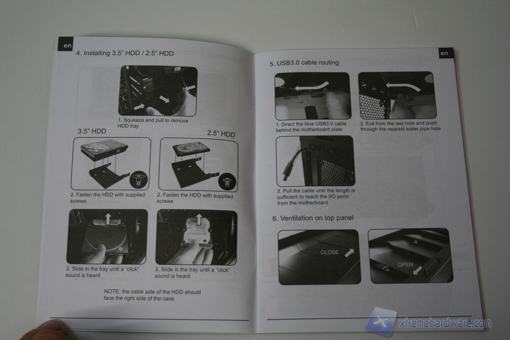 Fatto questo, e bloccato il lettore tramite il sistema di blocco laterale, si richiude il pannello frontale e si passa all’installazione della scheda madre. Se si possiede un dissipatore Intel, tramite il solito sistema push-pin, sarà possibile installarlo successivamente, altrimenti se volete potete già procedere ad installare il backplate del dissipatore della CPU, facendo attenzione a stendere un sottile velo di pasta termica alla base della CPU stessa. In sostanza, se la vostra scheda madre non è mini-ITX, dovrete prima montare i distanziatori nei fori per il formato ATX, serrarli molto bene – consigliamo una pinza larga 1cm durante quest’operazione, su ogni cabinet – e poi apporre la scheda madre, serrandola con le viti fornite nella confezione. Se avete un dissipatore aftermarket potete utilizzare il foro posteriore, che è molto pratico e vi aiuterà non poco all’atto della procedura. Dopo aver montato il dissipatore sulla scheda madre, sarà necessario montare la scheda video, le RAM ed infine procedere all’assemblaggio dei cavi di connessione del cabinet alla scheda madre. Per fare un lavoro pulito consigliamo l’utilizzo delle fascette restringenti fornite in bundle. Giusto a titolo informativo riportiamo il cablaggio eseguito posteriormente, ma state certi che con una maggiore cura ed attenzione ai particolari il lavoro sarà ancora migliore. Terminata l’operazione vi consigliamo di connettere tutte le ventole che avete a disposizione.